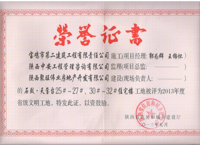 2013年省級文明工地(虢鎮(zhèn)名苑)