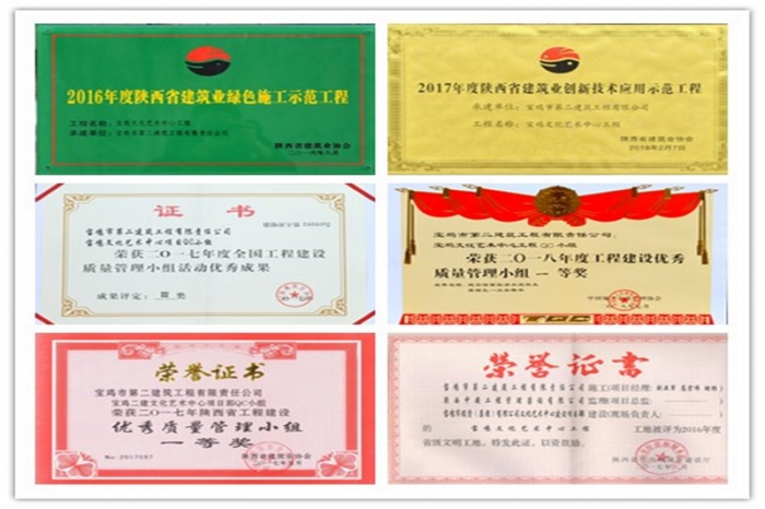 艱難困苦,玉汝于成。通過(guò)項(xiàng)目團(tuán)隊(duì)全體員工的共同努力,寶雞文化藝術(shù)中心項(xiàng)目先后被評(píng)為“2016年度寶雞市優(yōu)質(zhì)樣板主體工程”“2016年度陜西省建筑業(yè)綠色施工示范工程”“2016年度陜西省省級(jí)文明工地”“2017年度陜西省建筑業(yè)創(chuàng)新技術(shù)應(yīng)用示范工程”“2017年度陜西省建筑業(yè)優(yōu)質(zhì)結(jié)構(gòu)工程”;項(xiàng)目部先后榮獲全國(guó)工程建設(shè)質(zhì)量管理小組活動(dòng)成果獎(jiǎng)4項(xiàng)、陜西省工程建設(shè)優(yōu)秀QC小組成果獎(jiǎng)7項(xiàng),申報(bào)陜西省省級(jí)工法1項(xiàng);項(xiàng)目部先后榮獲公司先進(jìn)黨支部、先進(jìn)單位、經(jīng)濟(jì)貢獻(xiàn)特別獎(jiǎng)單位、“安康杯”安全文化知識(shí)競(jìng)賽活動(dòng)二等獎(jiǎng),規(guī)劃局系統(tǒng)先進(jìn)黨支部等榮譽(yù)。